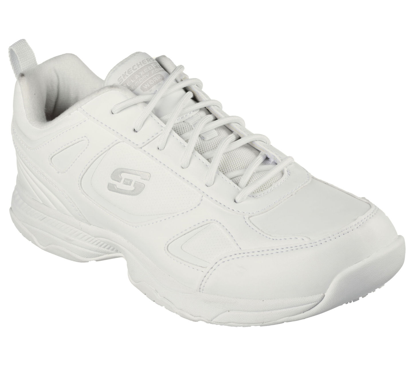 Keep yourself comfortable and safe in Skechers Work Relaxed Fit®: Dighton SR. Smooth leather and synthetic upper on a lace-up sporty casual slip-resistant sneaker with cushioned Memory Foam insole.